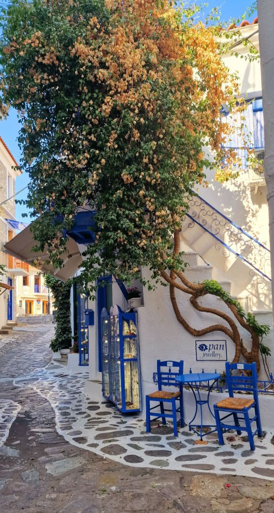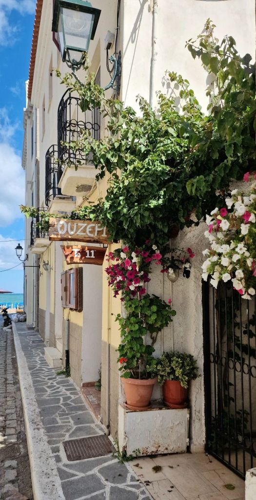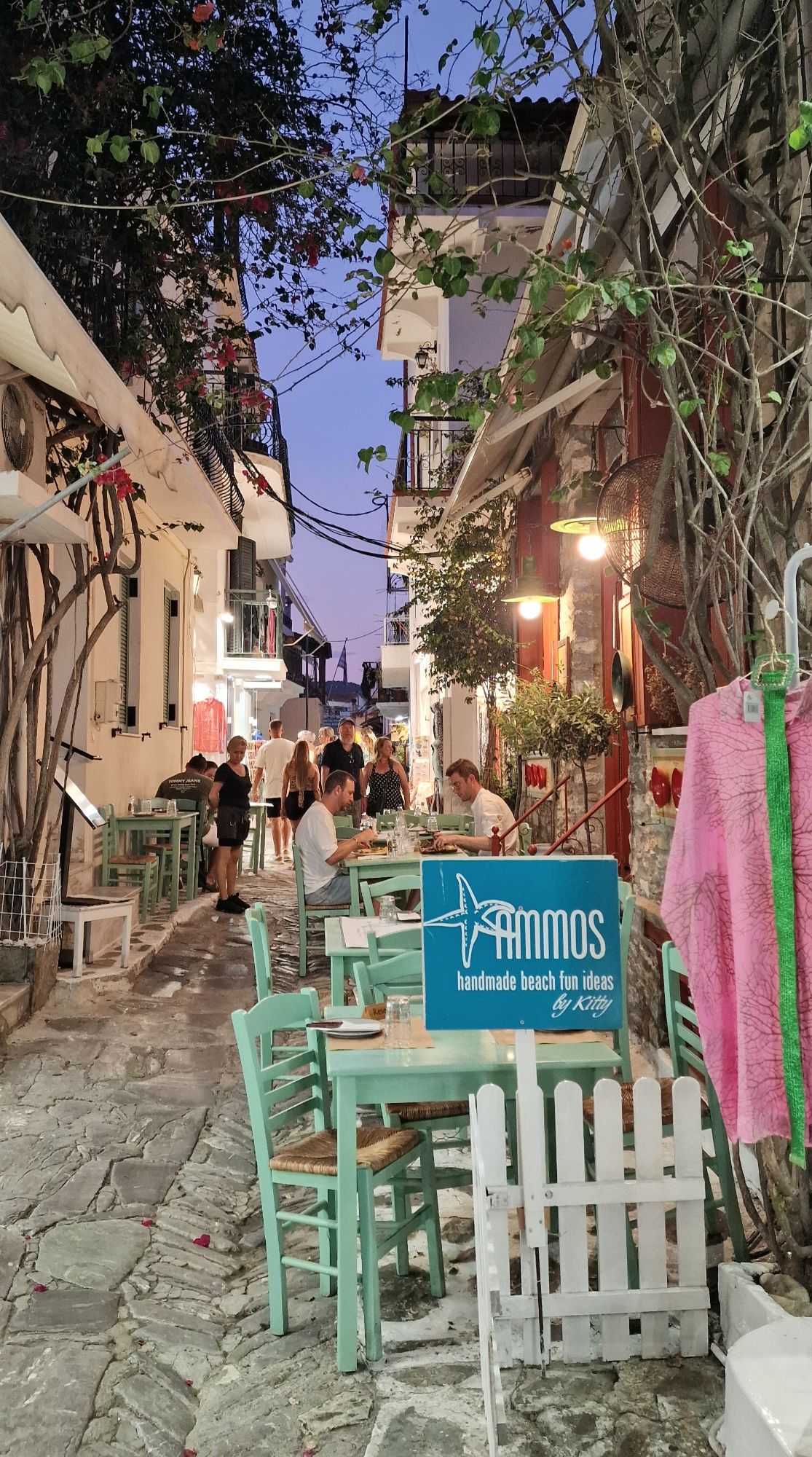 Vi strosar runt bland Naoussa’s fina gränder vår sista kväll tillsammans….👇💙🧿🇬🇷