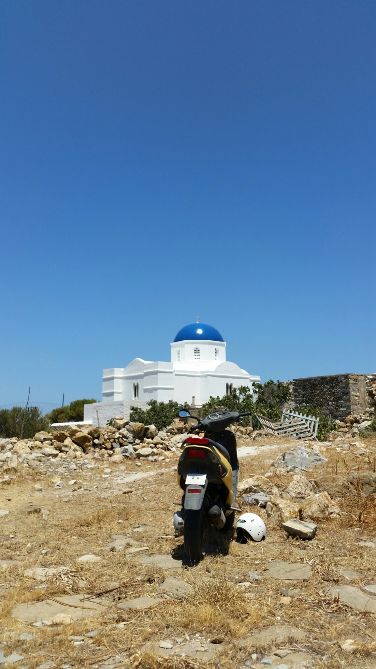 Glada och förväntansfulla ställer vi vår vespa i Choran byn Panagia och ska nu börja vår spännande vandring mot en grottkyrka vi läst lite om på nätet!!