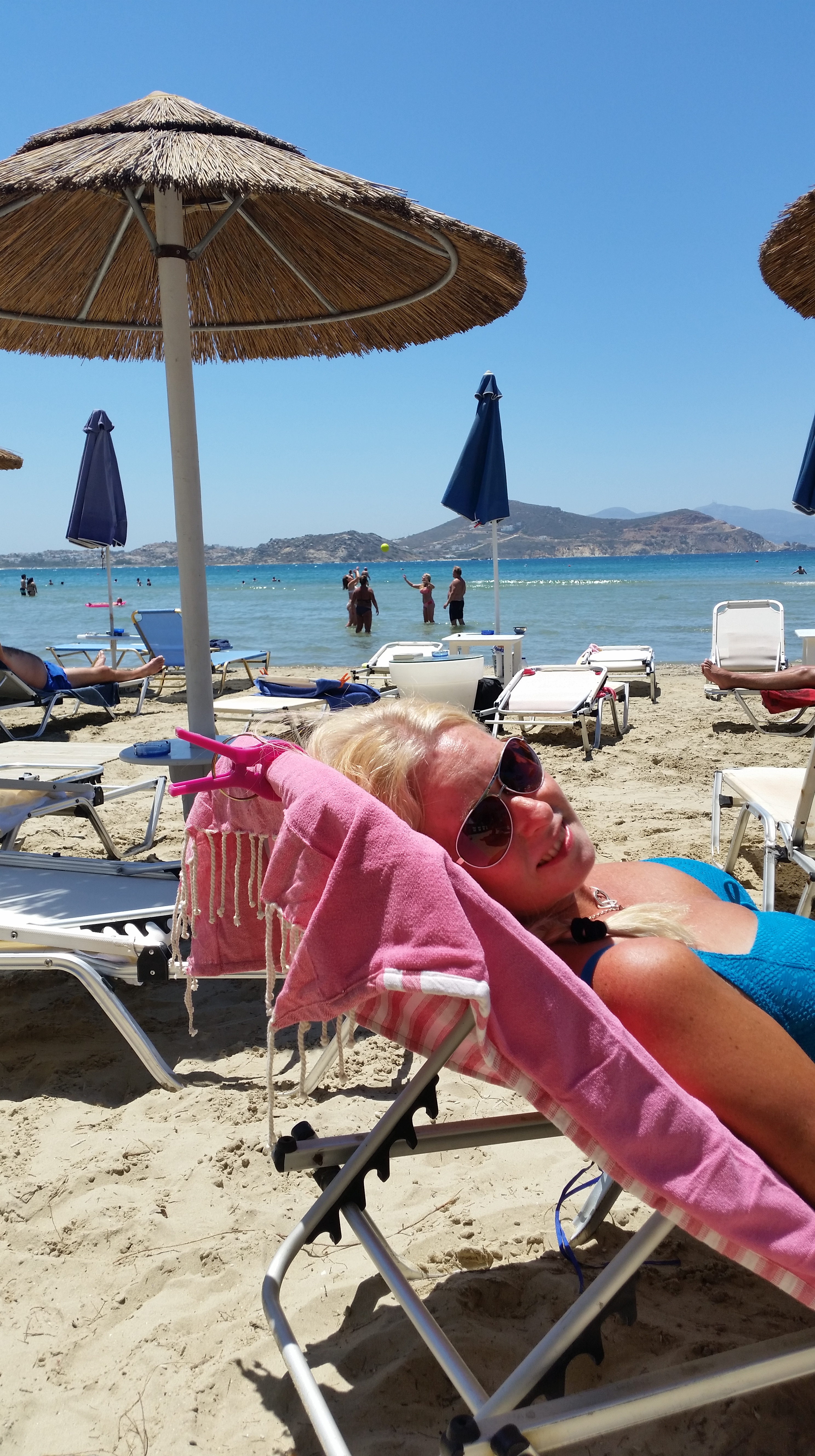 Å här nedan ligger jag på ”Saint Georges Beach”😎👙🌞….vi kallar den stads stranden eftersom den ligger i direkt anslutning till Naxos stad!! Väldigt barnvänlig & duger gott för en halvdag vid ankomst eller avgång, men är inte en strand ”jag” väljer för en heldag…..