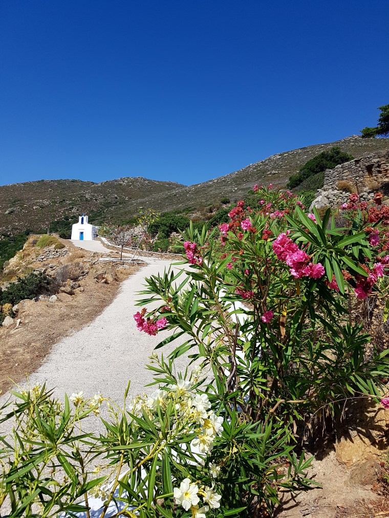 Choran är rätt så kuperad med slingrande små smala vitkalkade gator som ömsom går uppåt & ömsom lite nedåt igen……..