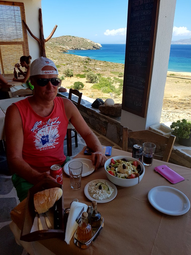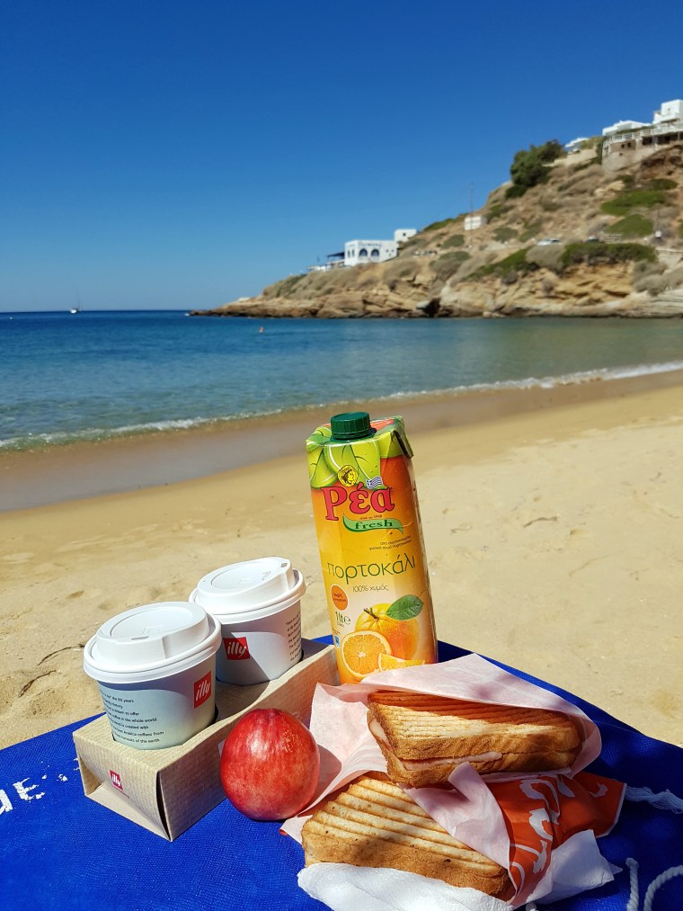 En oerhört lat slappe-dag innan avfärd, där vi startar med en riktigt delikat frukost direkt på Mylopatas stranden!!👌