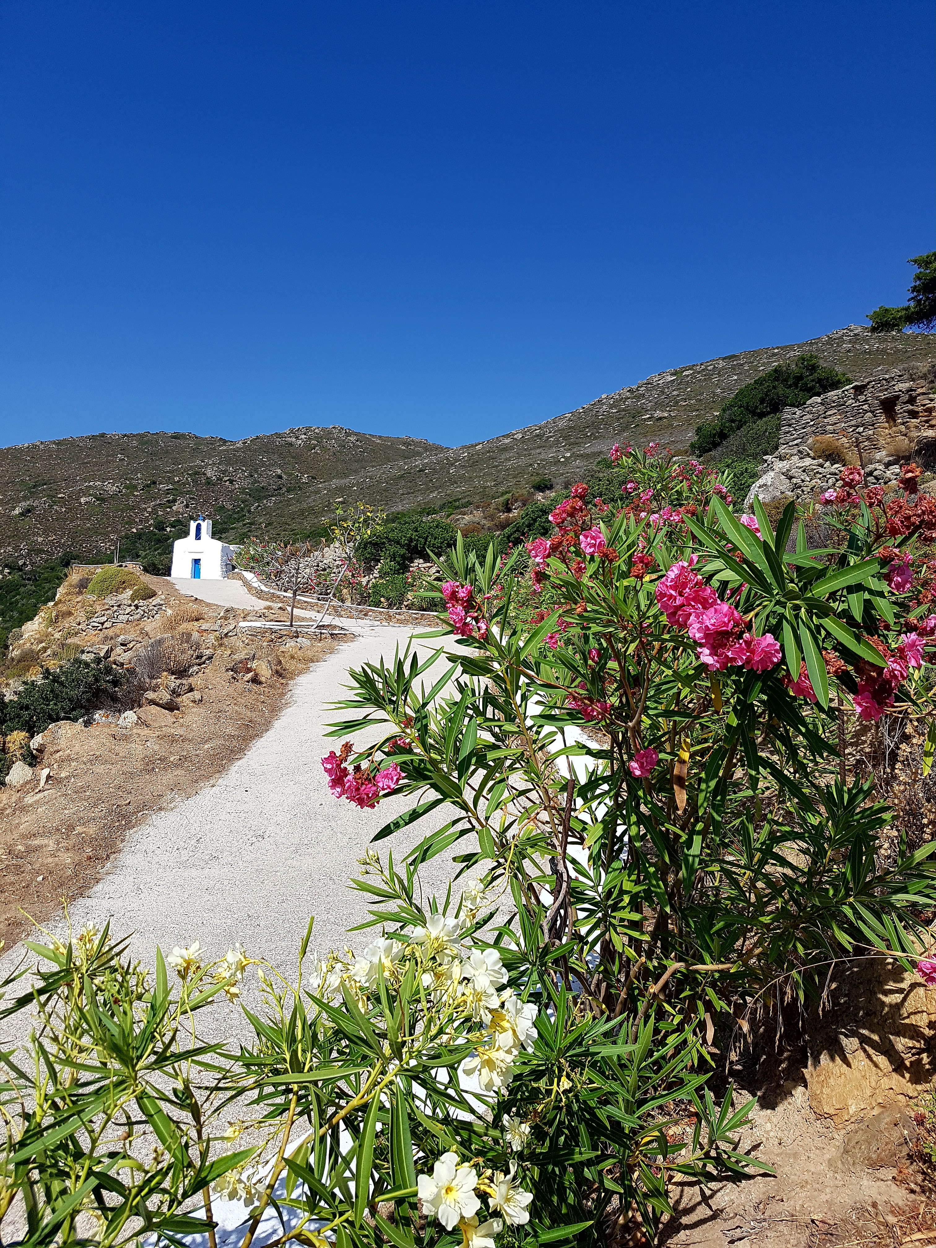 Choran är rätt så kuperad med slingrande små smala vitkalkade gator som ömsom går uppåt & ömsom lite nedåt igen……..