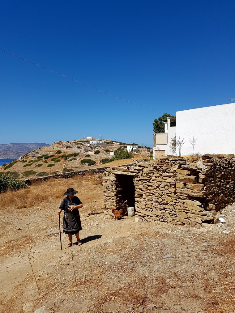 Och plötsligt mitt emellan 2 hus i choran, så står hon bara där…….Yiayia på sin gård o med sin höna i sällskap!!!
