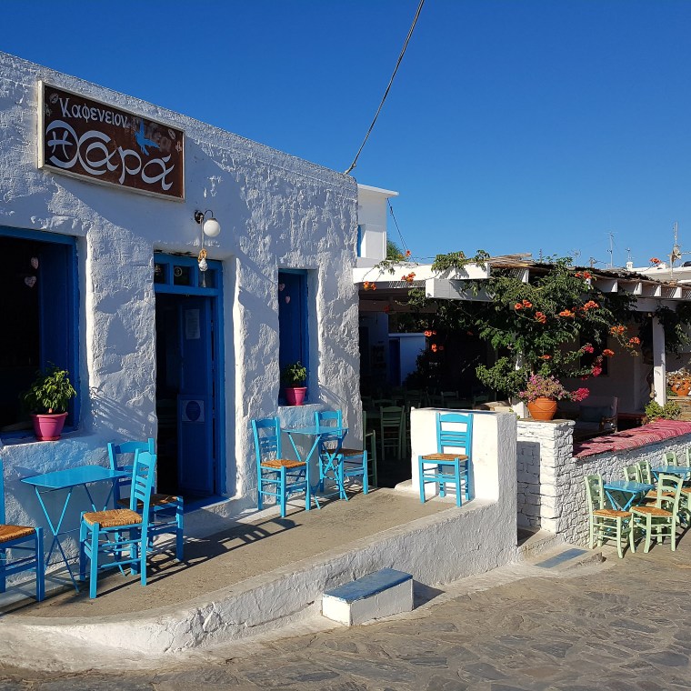 På kvällen samlas alla & då menar jag verkligen ”ALLA” i den lilla Choran, barnen springer runt benen på oss & har gömme😍…….samtidigt sitter gamlingarna utanför supermarketen (läs mini🤣) och samtalar o byter ett ord med alla förbipasserande. Dom medelålders och ev barnens föräldrar hittar man kanske på Cafét smuttandes på en grek- kaffe eller en liten ouzo!!