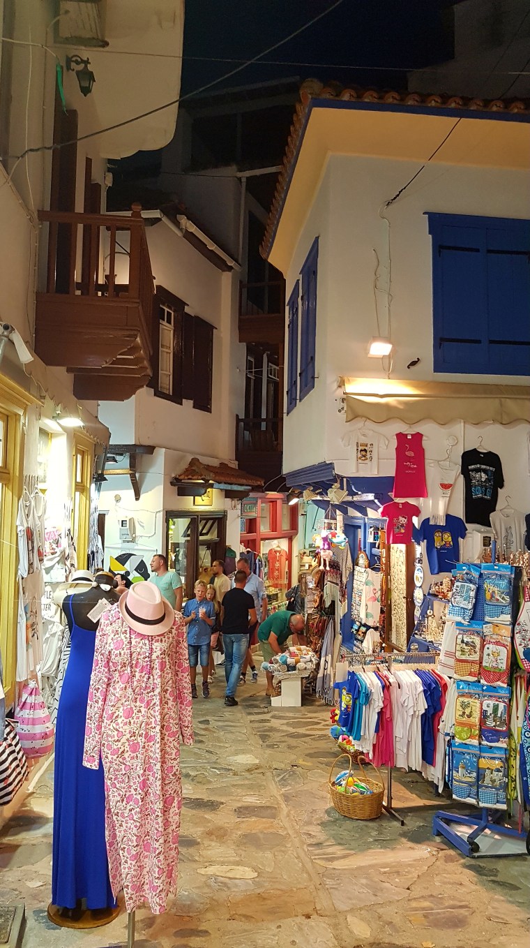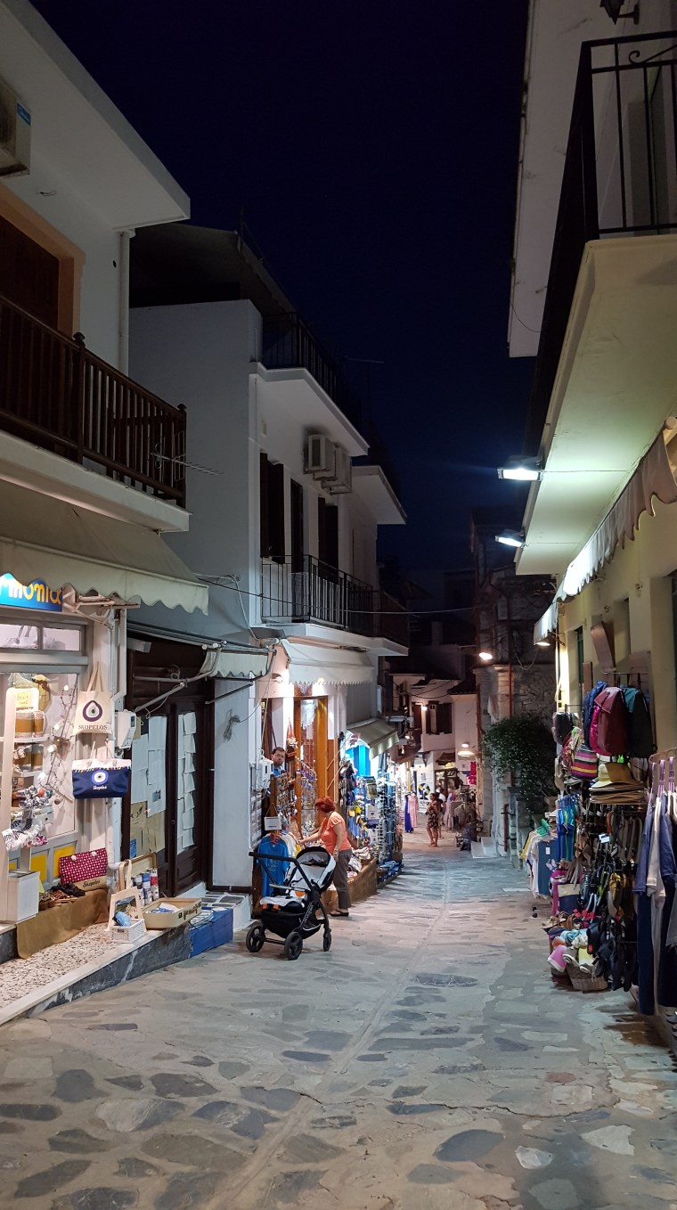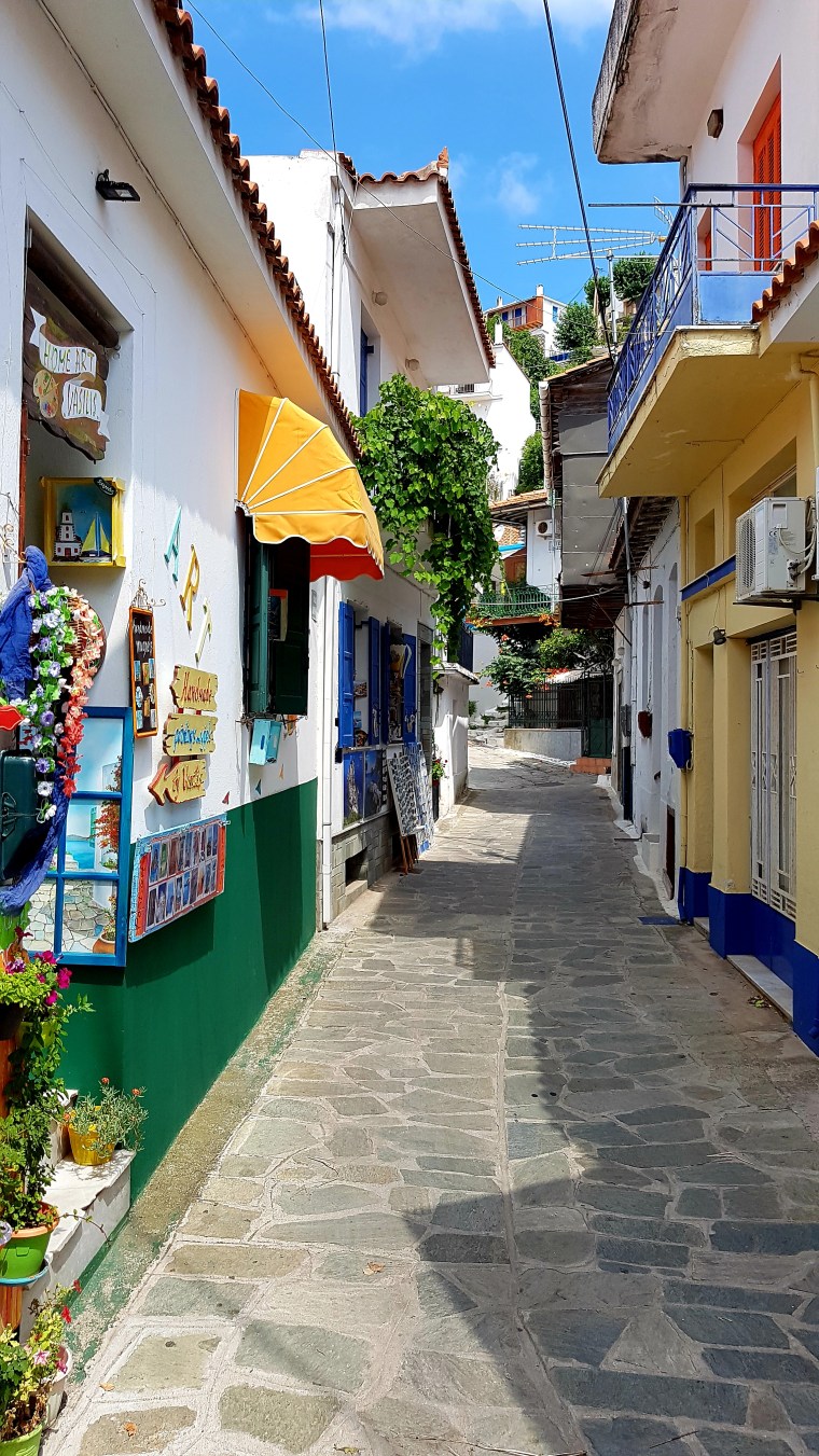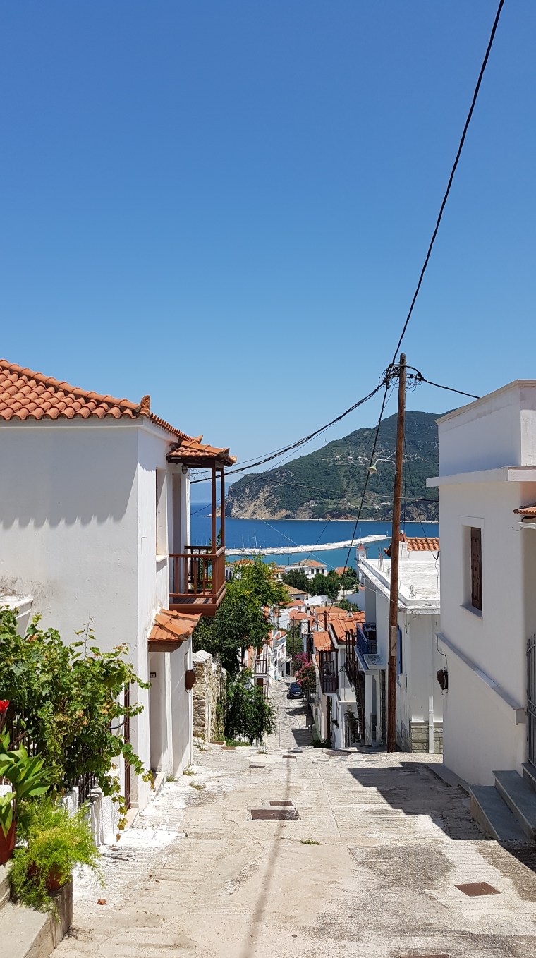 Börjar i ett ganska lugnt tempo med promenad genom många av Skopelos helt fantastiskt mysiga gränder……..