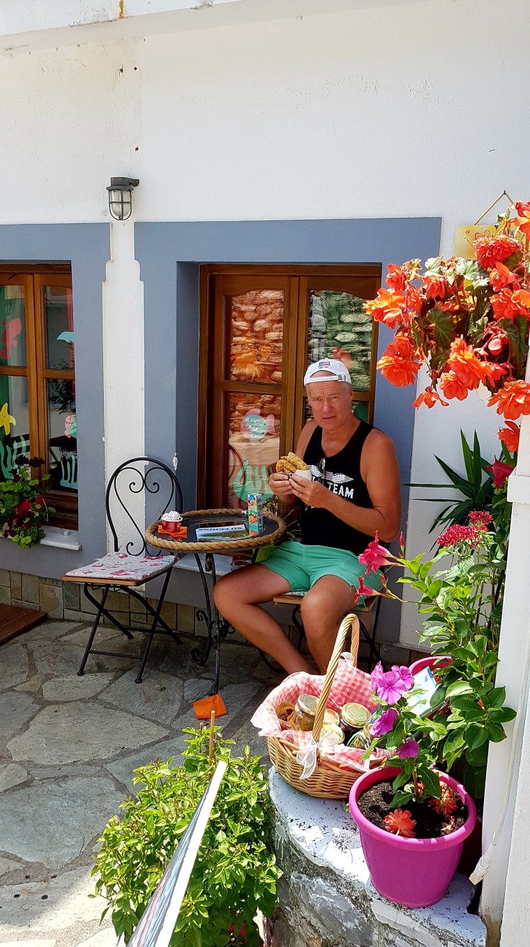 Vi börjar dra oss neråt igen & magarna knorrar efter fika, vilken vi intar på ”Νησιωτισσα”….Håkan med den typiska orm formen av paj på Ön & jag med ljuvlig hemmagjord glass…..