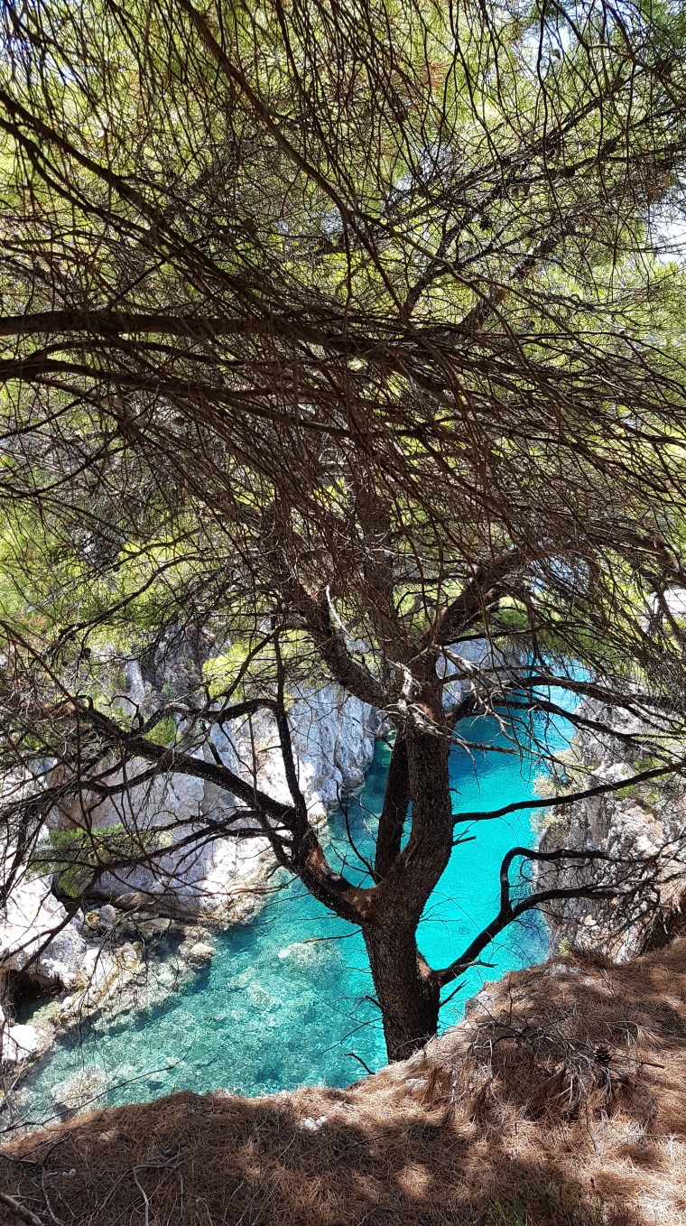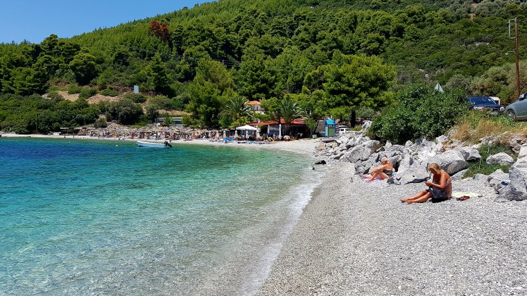 …..med sååå grönt kristallklart vatten!!!👌👌👌stranden består av småsten och det finns flera tavernor & tror faktiskt dom flesta hade gratis solsängar om man vill ligga på en sådan, ifall man köpte något då vill säg!!!