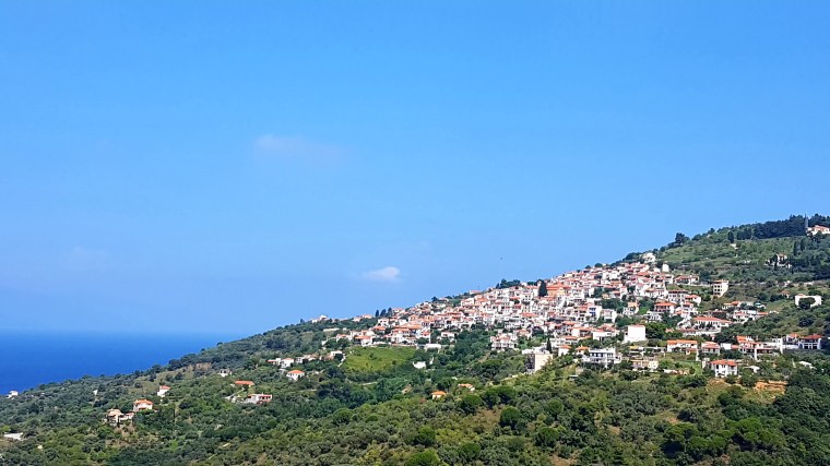 Första stoppet blir i byn Glossa som ligger på nordvästra delen av Ön ca 2 1/2 mil från Skopelos stad ……Glossa är en av dom större byarna på Skopelos med sina nästan 1000 bybor!!!🇬🇷💙🇬🇷På avstånd ser byn inte jättestor ut…..👇👇👇många av husen har utsikt mot Skiathos som ligger där ute i det blå…..