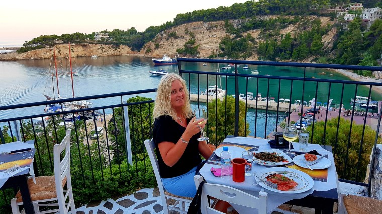 På kvällen har vi bokat bord på ”Café Bistro” som ligger högt upp i Patitiri med vansinnigt goo och lite annorlunda mat👌👌👌 & med en utsikt väl värd varenda trappsteg upp även mitt på dan i gassande sol (för o boka bord)!!! Tavernan är liten o populär så bord måste bokas innan!!!!👇