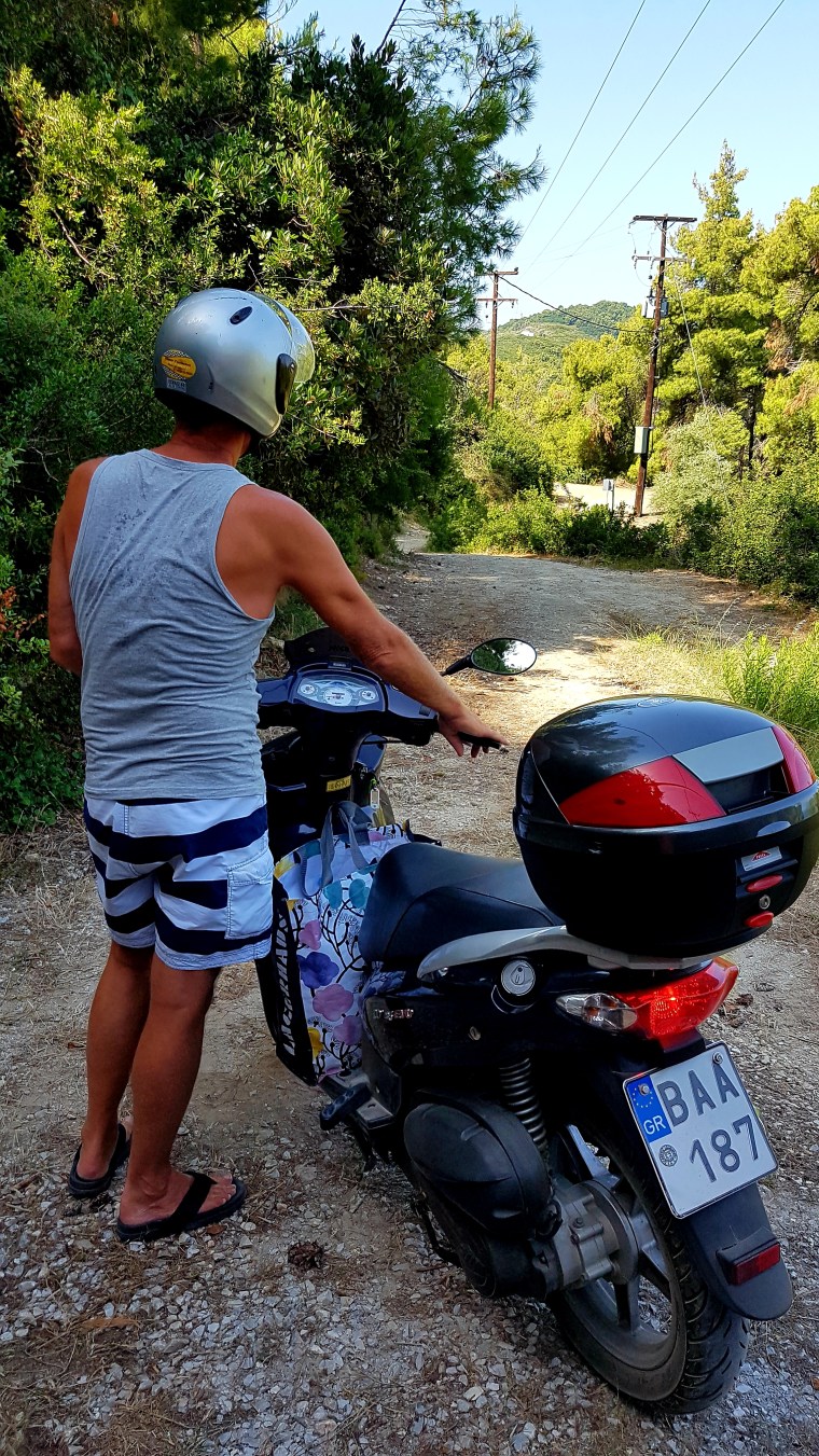 Vi hyr en vespa på en gång & när Håkan noga inspekterar diverse skrapmärken och bucklor innan vi hoppar upp (vi vill ju inte få skit för märken inte vi gjort🙄)…..så hör vi orden högt eka från vår moppe uthyrare ”att d gör inget om ni lämnar tillbaka den med lite repor – don’t worry – relaxed style here at Alonissos!!!!!”😂😂😂Det enda vi får till oss är -:never park at the yellow line!!!