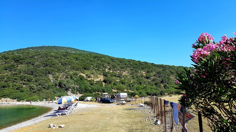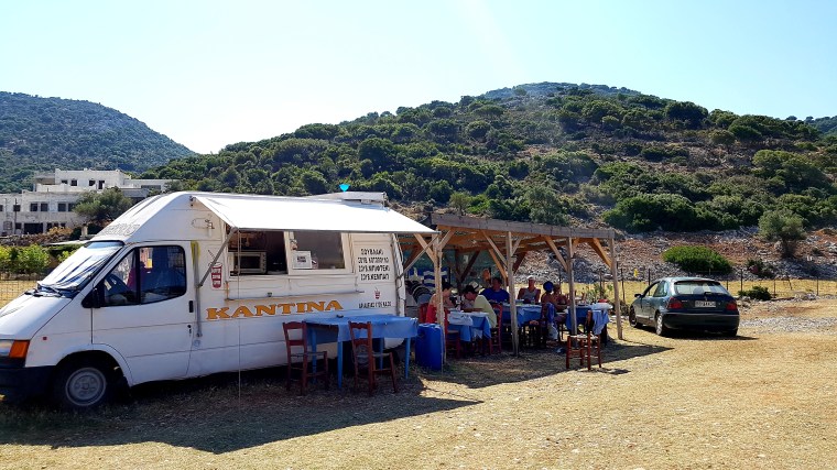 Å döm om vår förvåning när vi då kom fram till ”Gerakas”…….vi va inte själva….😲😲😲Sex personer till finns på plats!! Kostas har en ”kantina” (minimatvagn) & en liten servering bredvid där en frottéhandduk får agera den grekiska flaggan!!!🇬🇷🇬🇷🇬🇷