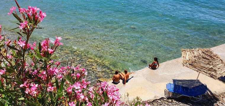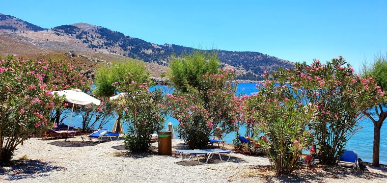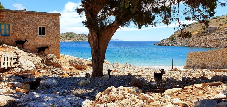 Stranden består av klappersten och grus, här finns några gratis solstolar trots högsäsong och 2 tavernor samt i princip hur mycket tama getter som helst!!!