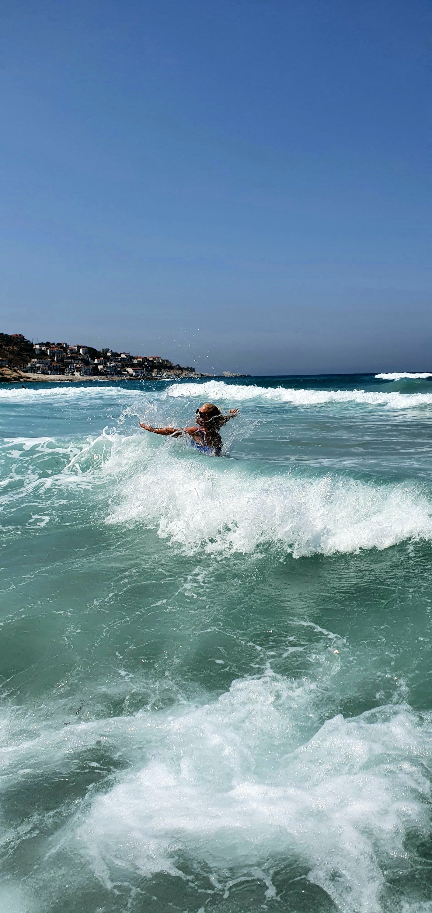 Vi Ă€r lite sena & för ovanlighetens skull hoppar jag av vĂ„r lilla vespa som en nĂ€stan lite vig och smidig tonĂ„ringđŸ˜Čblir mĂ€kta imponerad av mig sjĂ€lv faktiskt….jag, Ann som snubblar överallt….glidsnubblar i havet pĂ„ klapperstens strĂ€nder o vĂ€lter omkull i vĂ„gor etc……fick nĂ€stan nypa mig sjĂ€lv i armen för att förstĂ„ att det faktiskt var jag som nyss sÄÄ graciöst tagit mig av vĂ„rt fordon. Samtidigt som maken HĂ„kan parkerar o vi ser den lilla transport bĂ„ten komma in, sĂ„ springer jag i flippflopp mot den lilla tavernan i hamnen……köper bröd- tzatziki och grekisk sallad och 2 stora vatten som vi tar med som lunch. Springer tillbaka m kassen i handen & 2 min senare Ă€r vi ombord och ser denna vy frĂ„n bĂ„ten nĂ€r vi sakta puttrar ut frĂ„n lilla Maganitis viken!!!👇💯💯💯👇