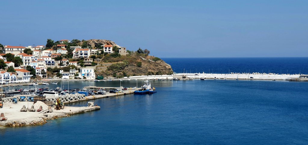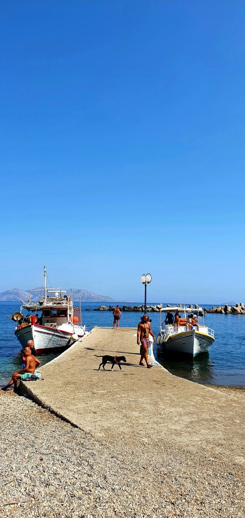 Efter en kort bĂ„tresa ankommer vi till hamnbyn Evidilos👇👇👇
