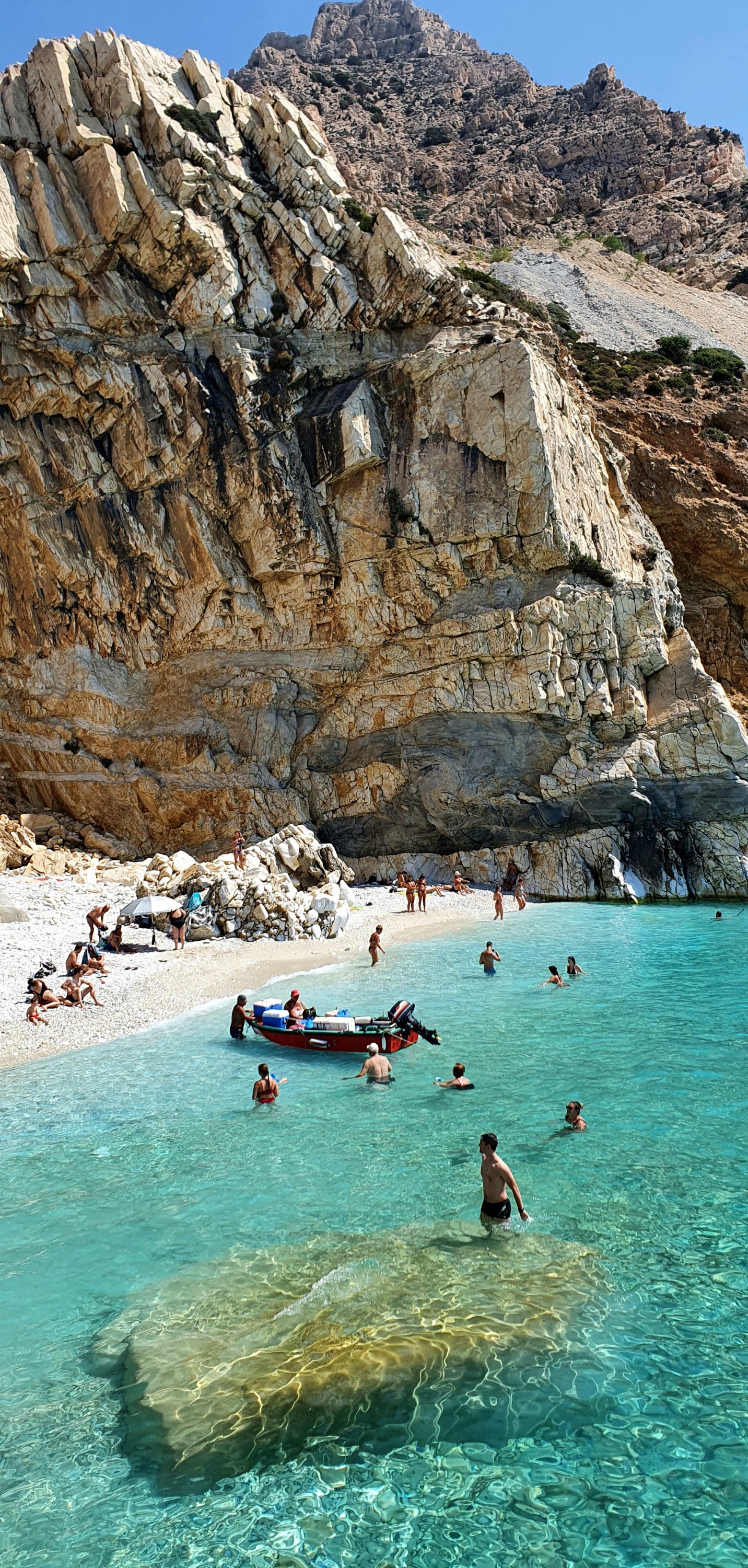 Stranden ”Seychellerna” pĂ„ Ikaria & vi vadar in med packningen över huvudet, hittar en skuggig plats lĂ€ngst bort mot berget….placerar ut vĂ„ra handdukar och intar vĂ„r lunch!!