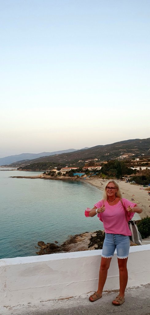 Tillbaka hemma pĂ„ kvĂ€llen och vi promenerar in mot Armenistis för lite sen middag……jag i förgrunden & stranden Livadia bakom mig!! Allra lĂ€ngst bort i bild vid det blĂ„a…dĂ€r bor vi pĂ„ kullen.