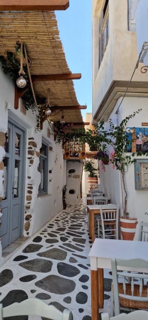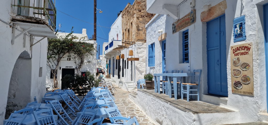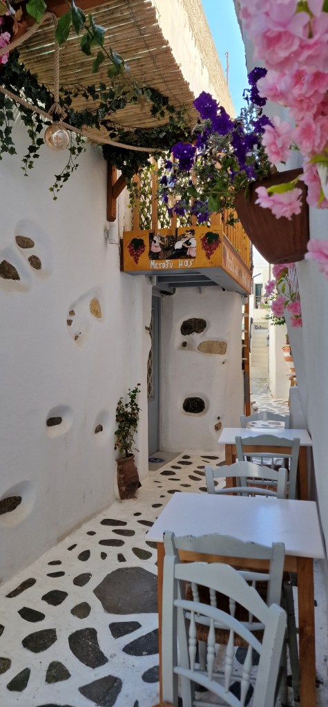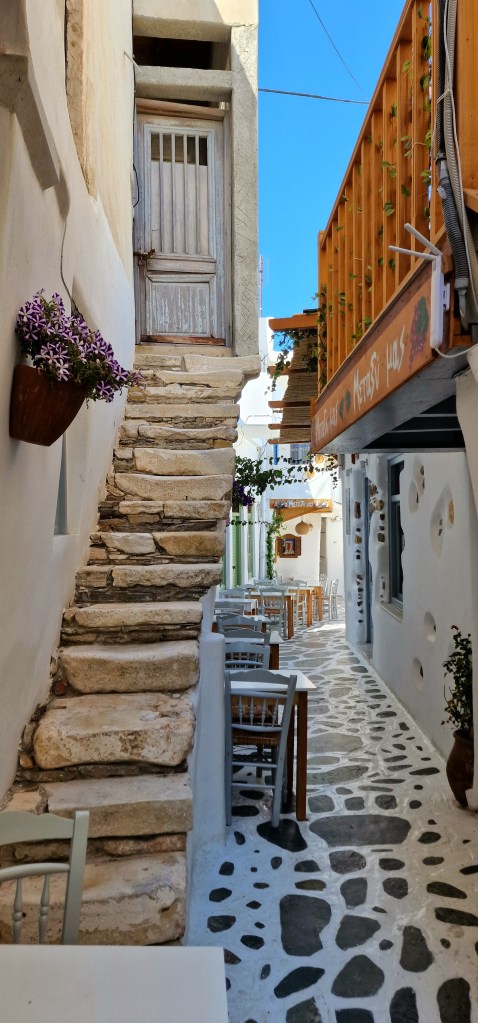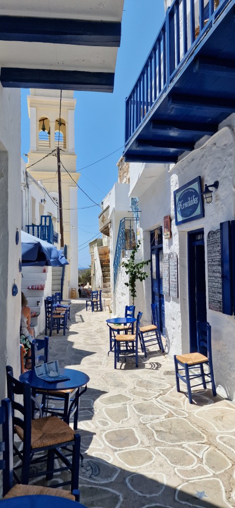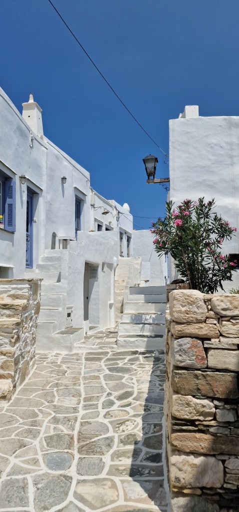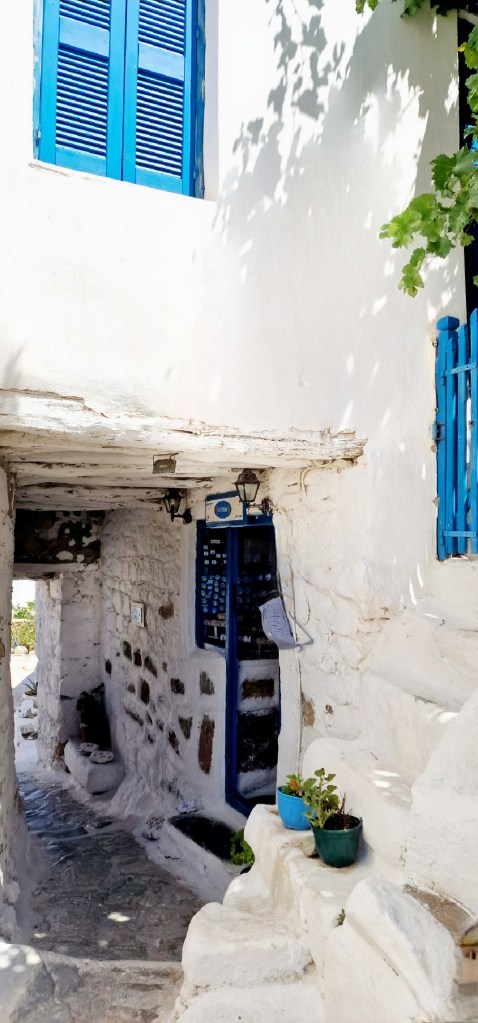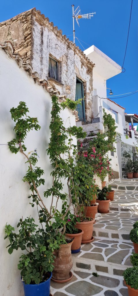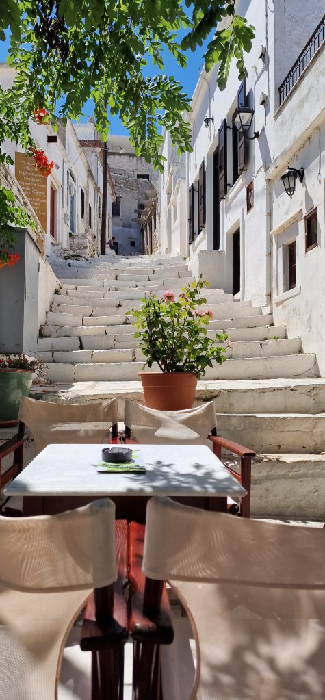 Lefkes är oxå en otroligt vacker by med drygt 500 fasta invånare…..här kryllar också av vitkalkade små smala gränder plus en hel del trappor – betydligt mer turister som hittat hit & det finns både butiker/caféer i större utsträckning…..