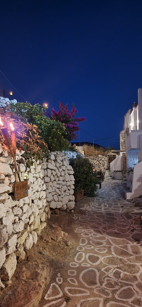 Vi strosar runt bland Naoussa’s fina gränder vår sista kväll tillsammans….👇💙🧿🇬🇷