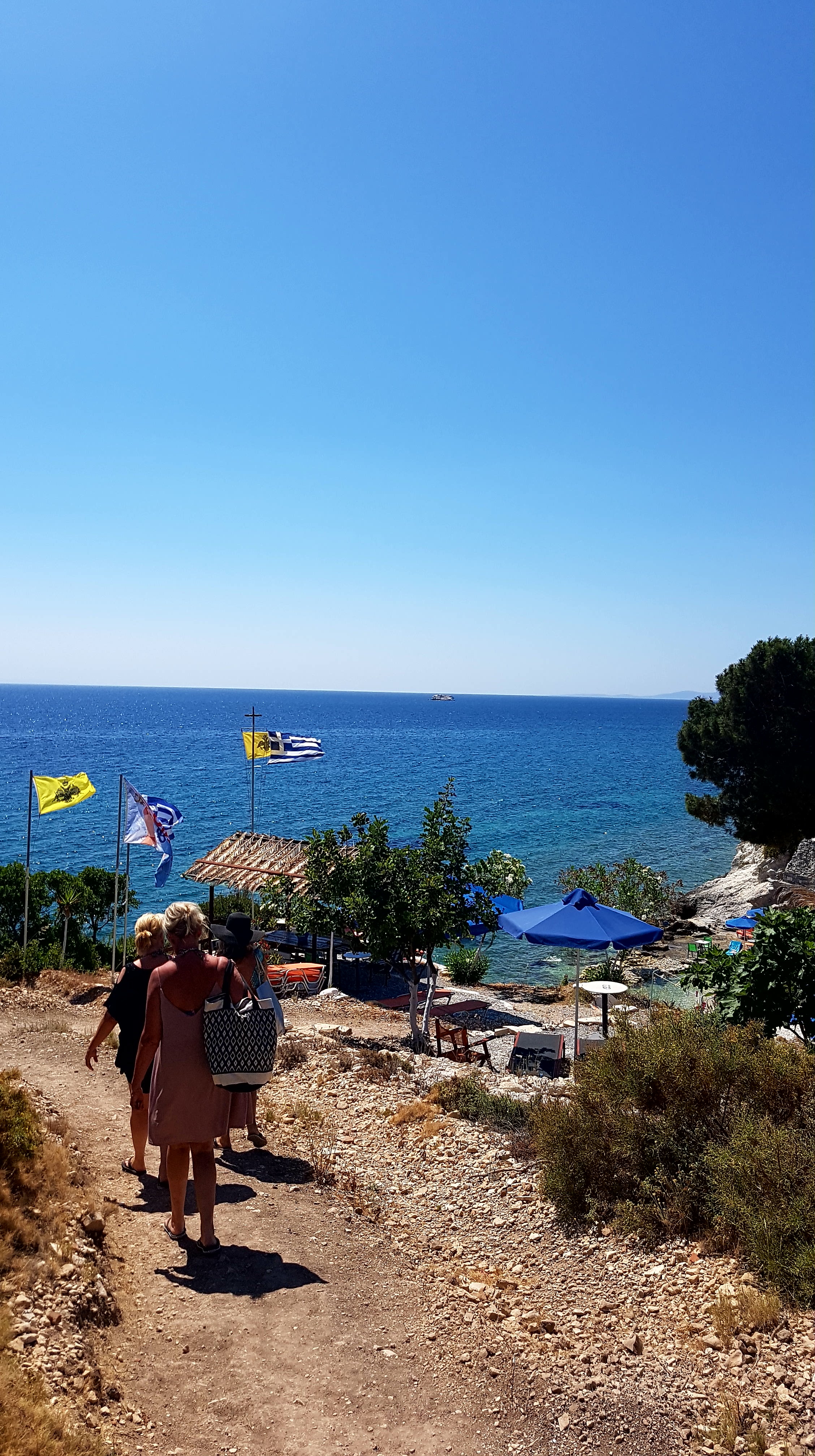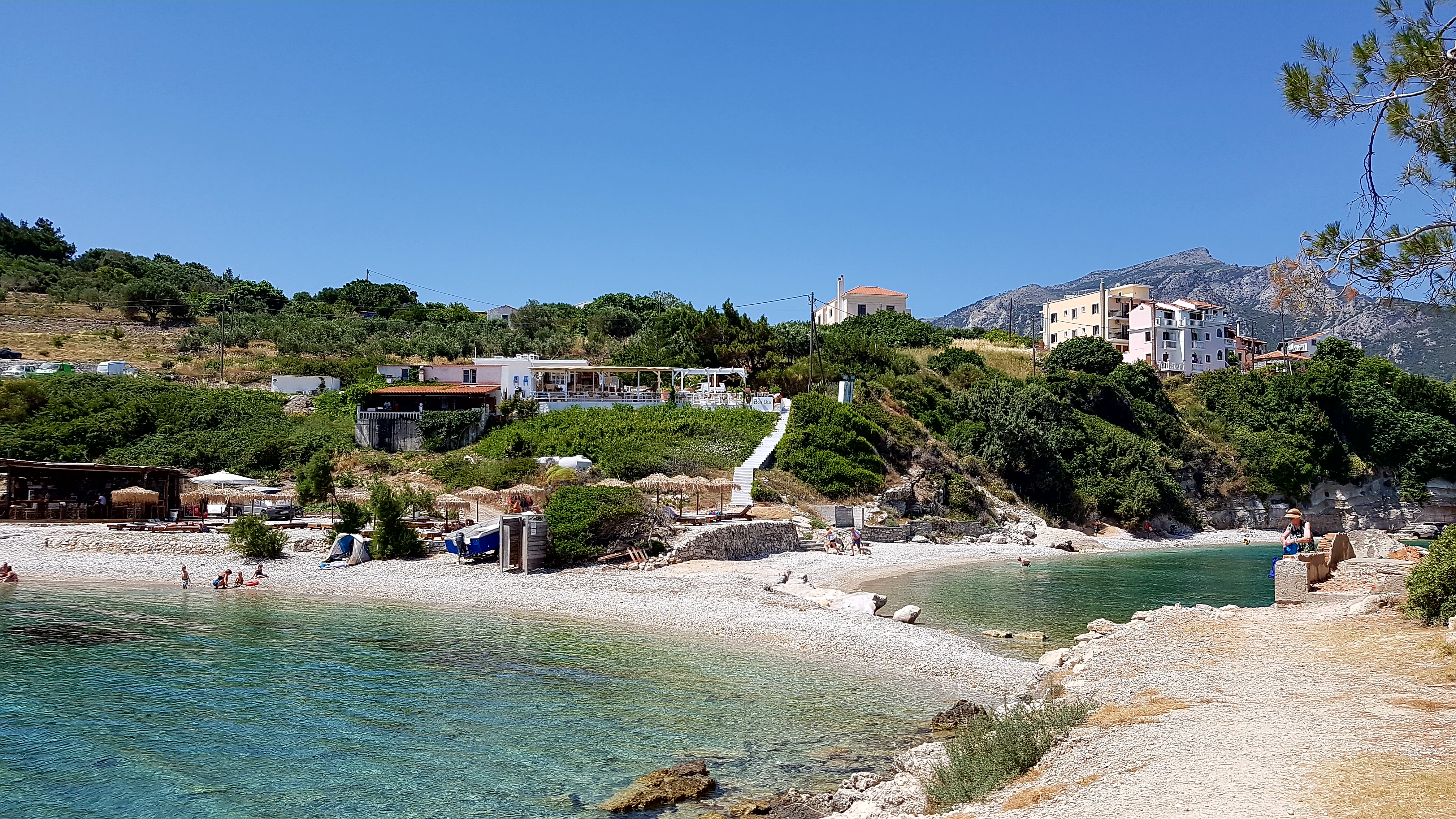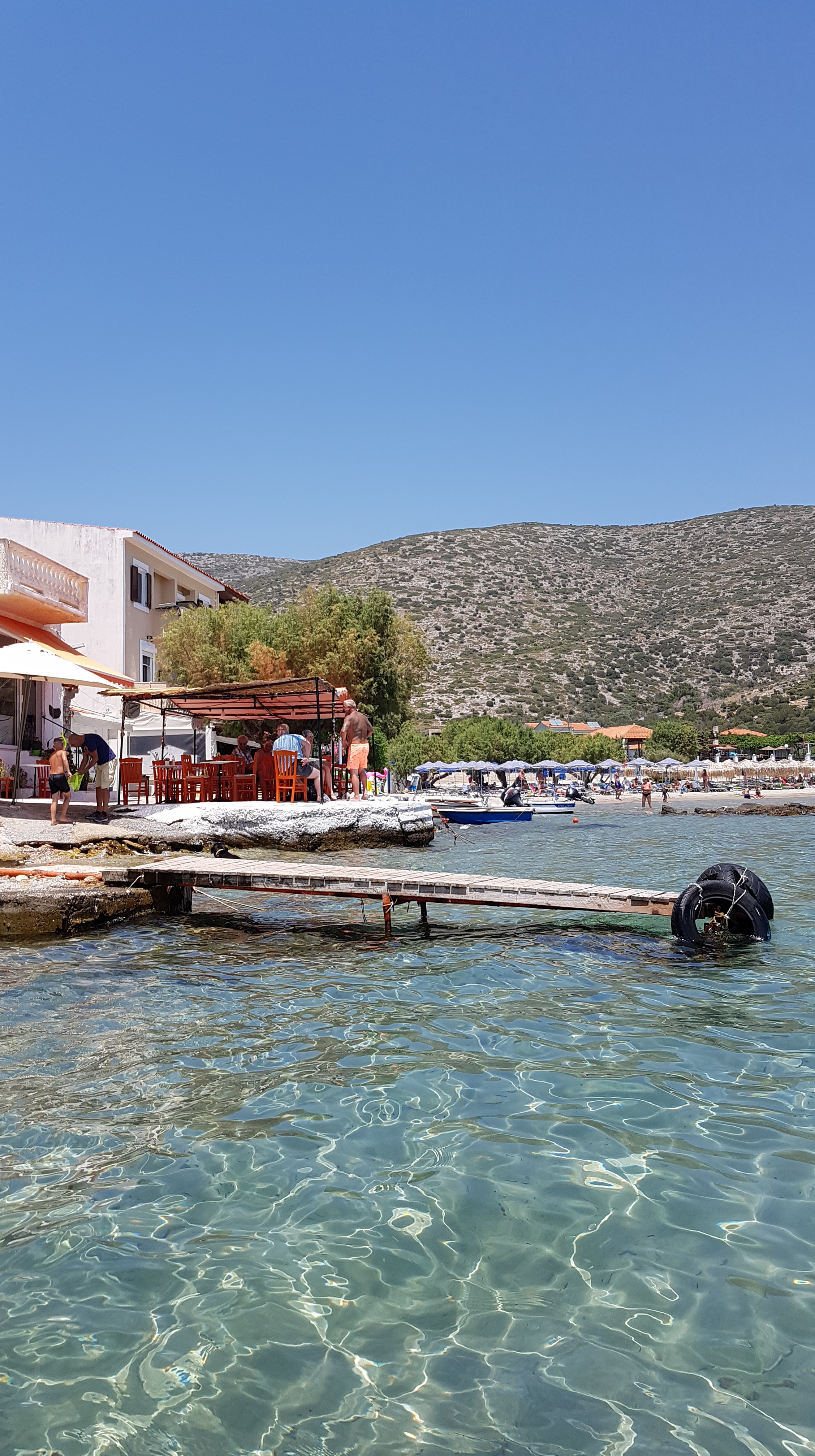 Besvikelsen är stor…..men vi tar oss till Tsamadou beach utanför Kokkari & vädret visar +33°c så ett dopp är välbehövligt!!!