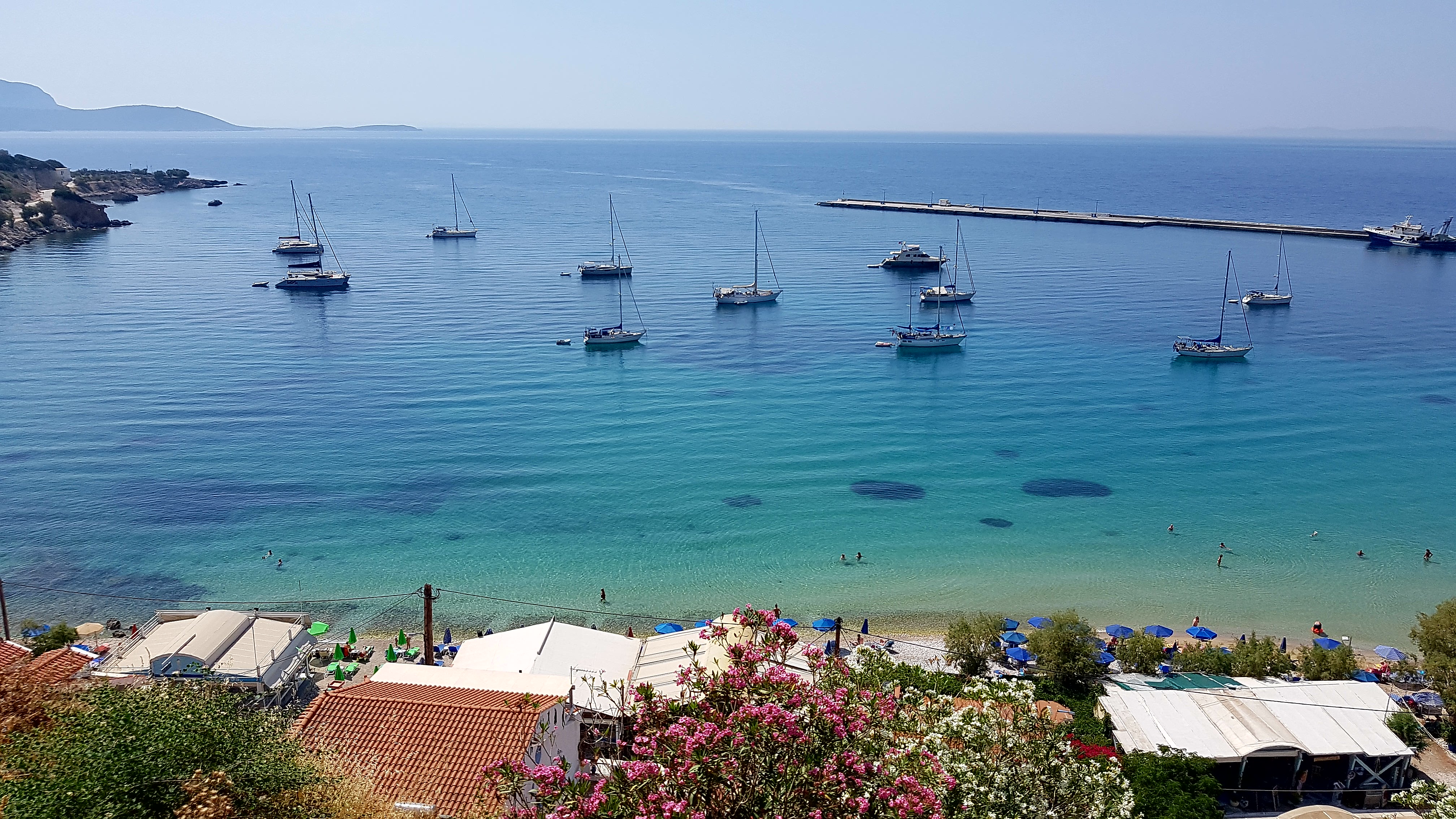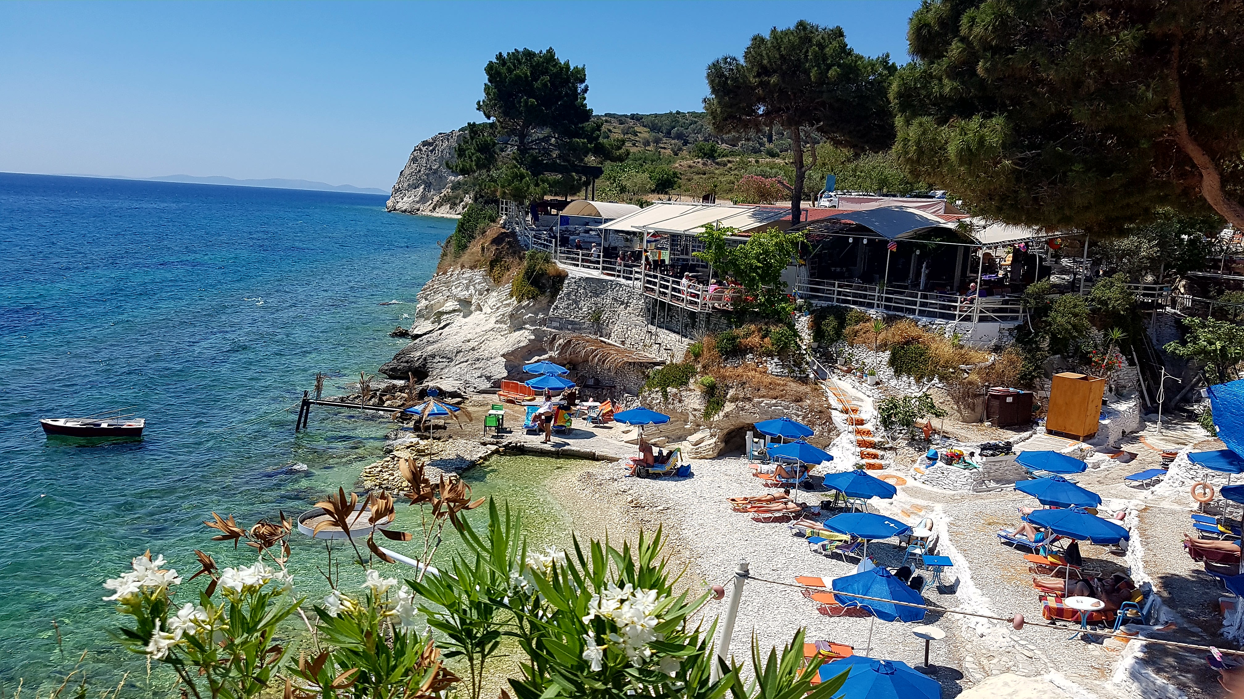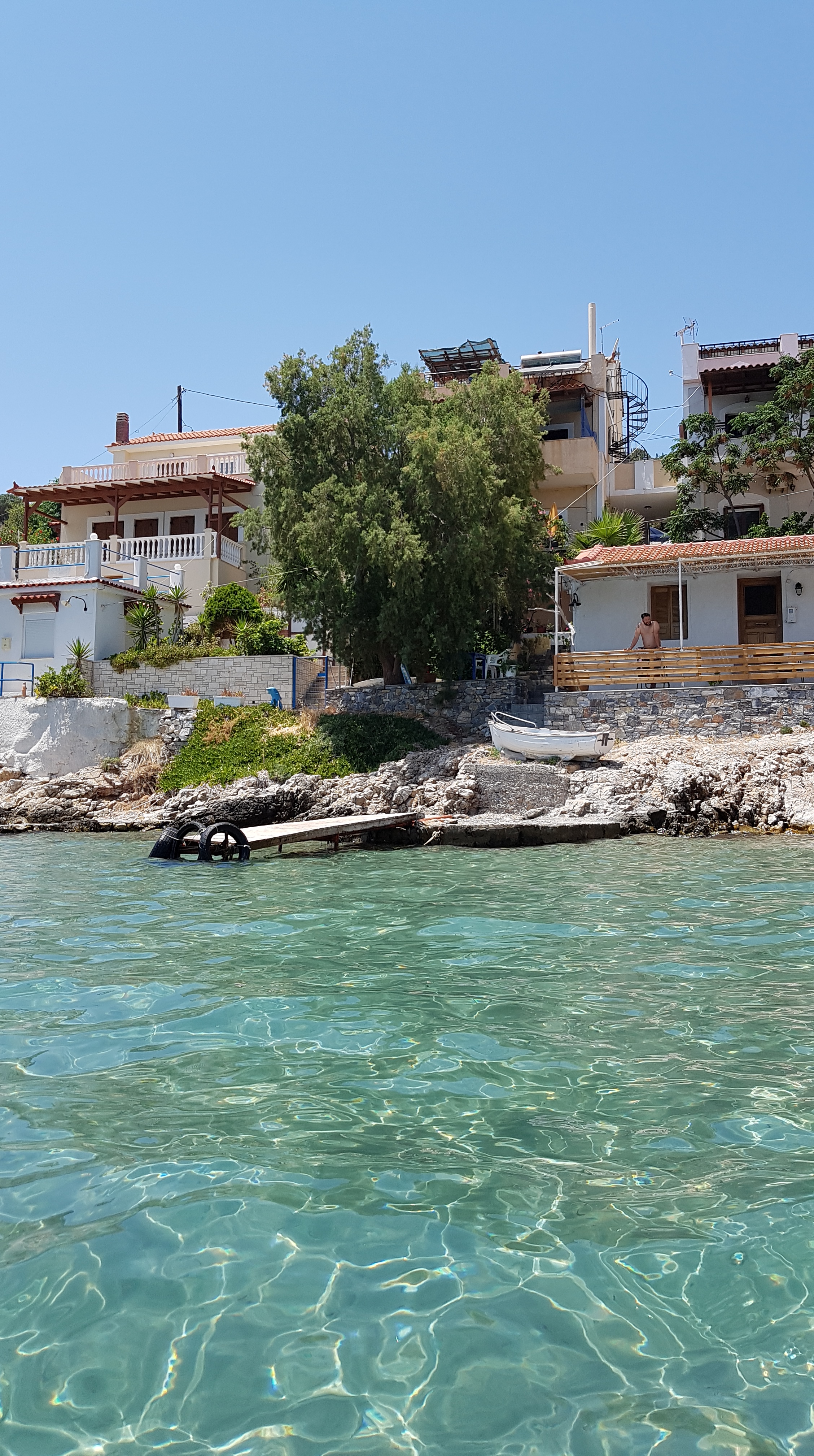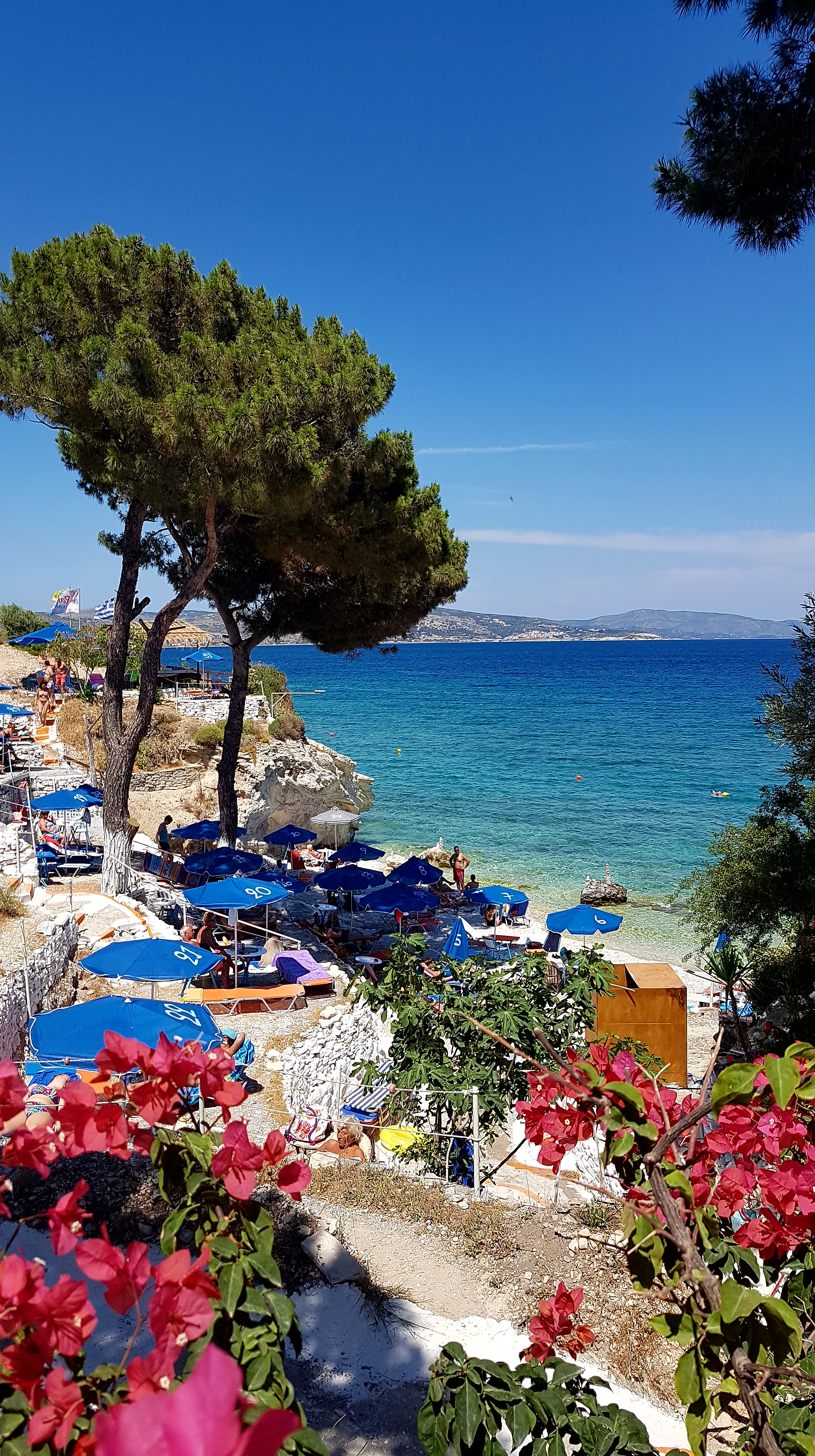 Besvikelsen är stor…..men vi tar oss till Tsamadou beach utanför Kokkari & vädret visar +33°c så ett dopp är välbehövligt!!!