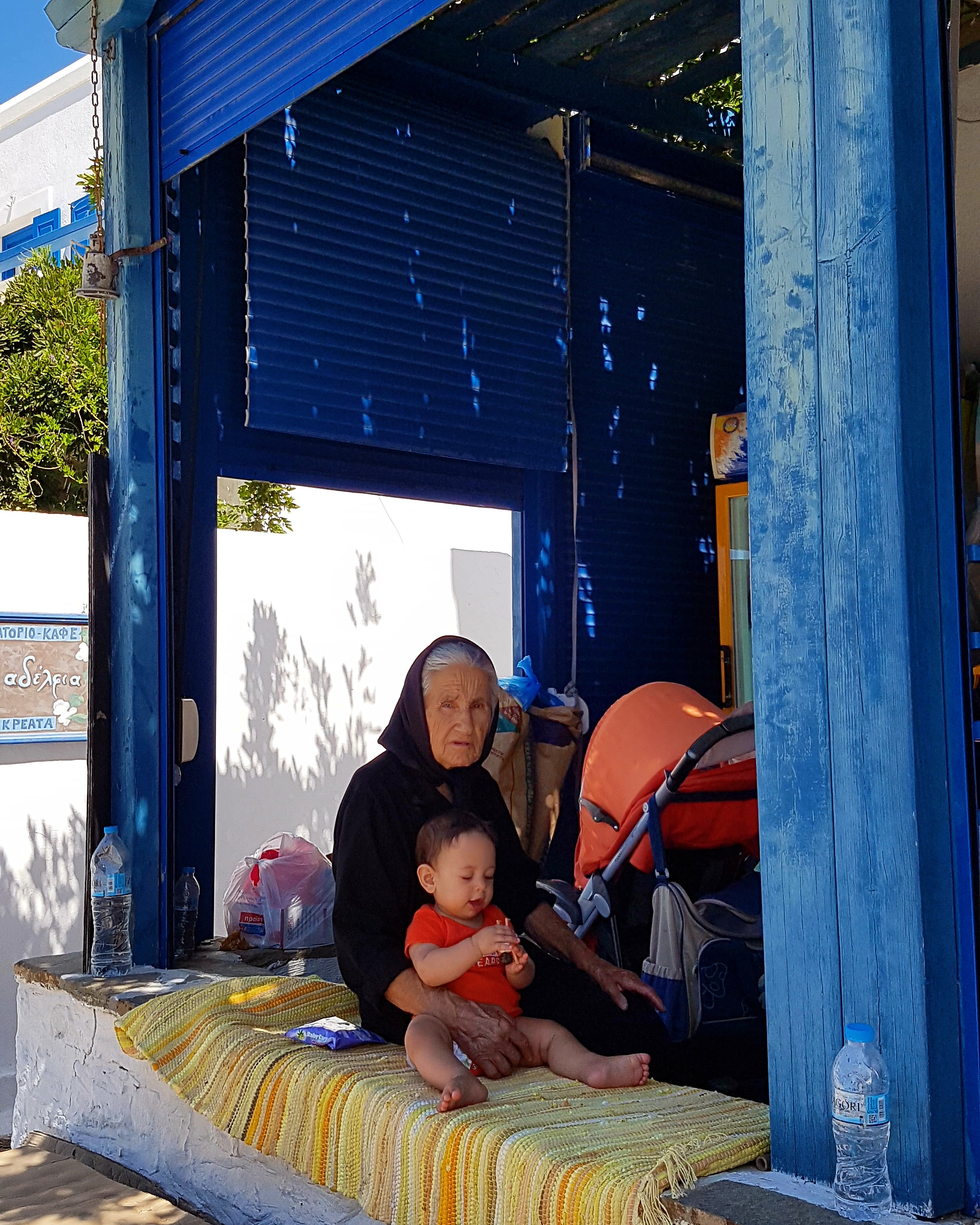 Snack mellan Yiayia & Melvin på promenad genom Choran….