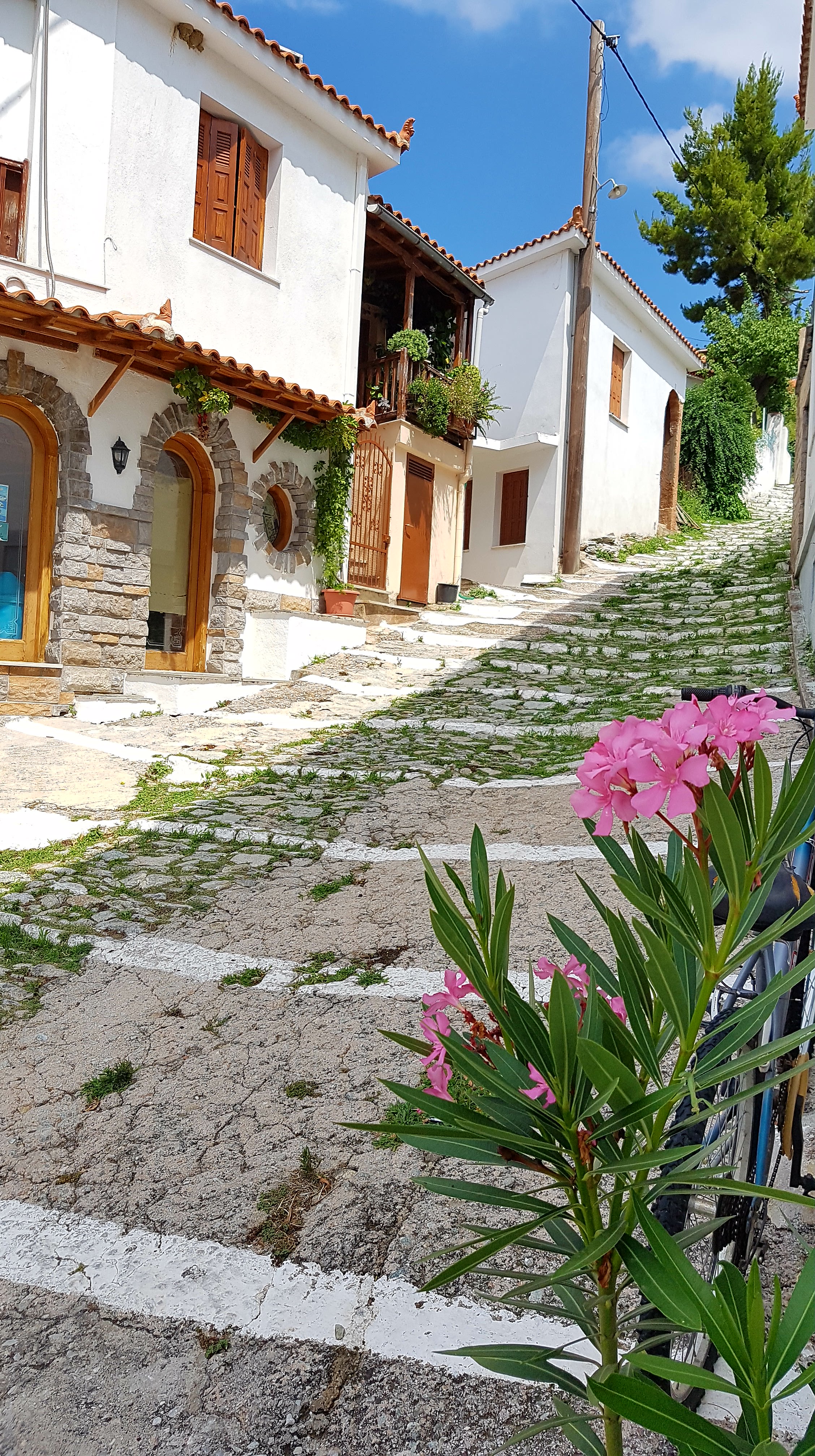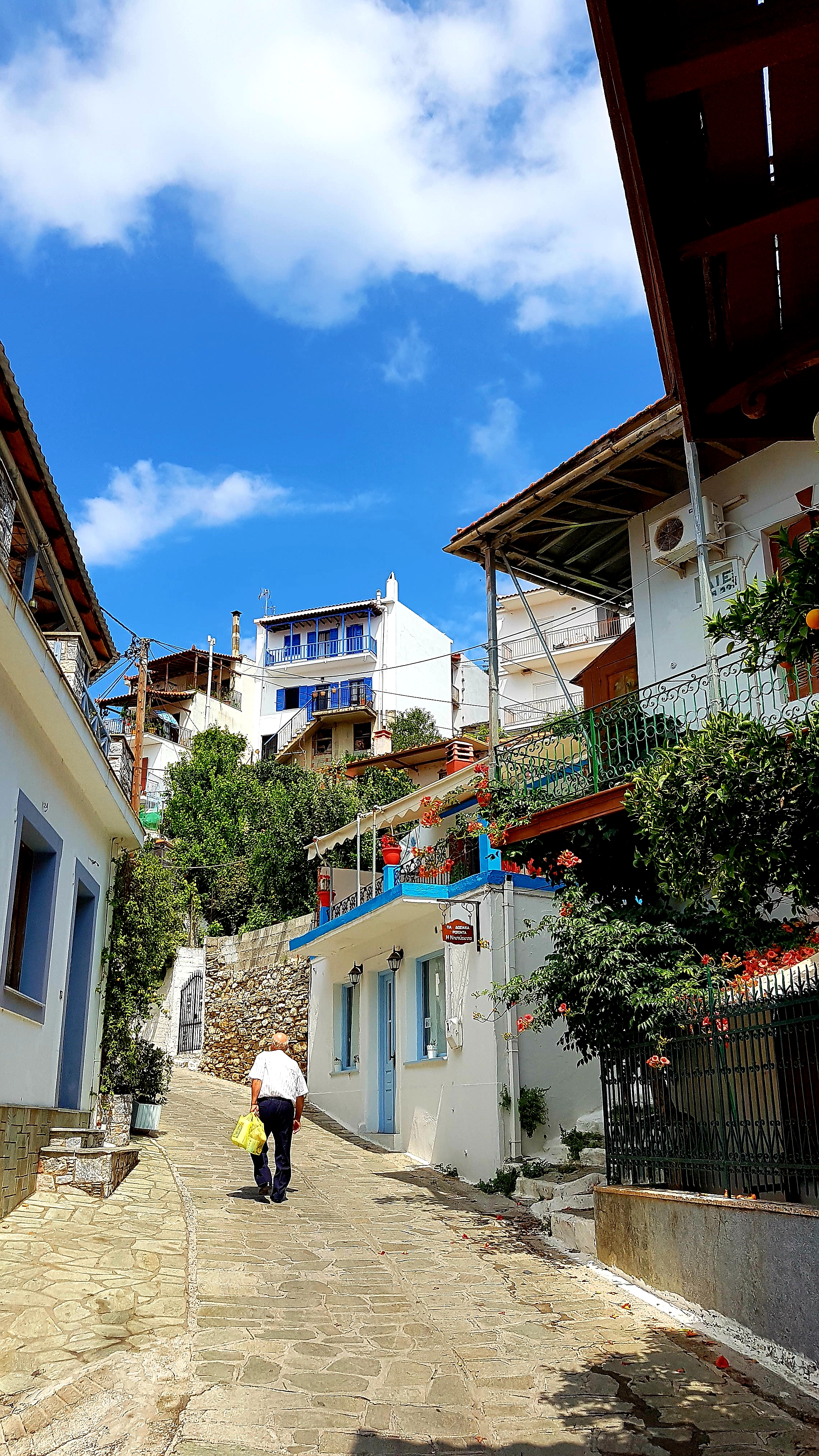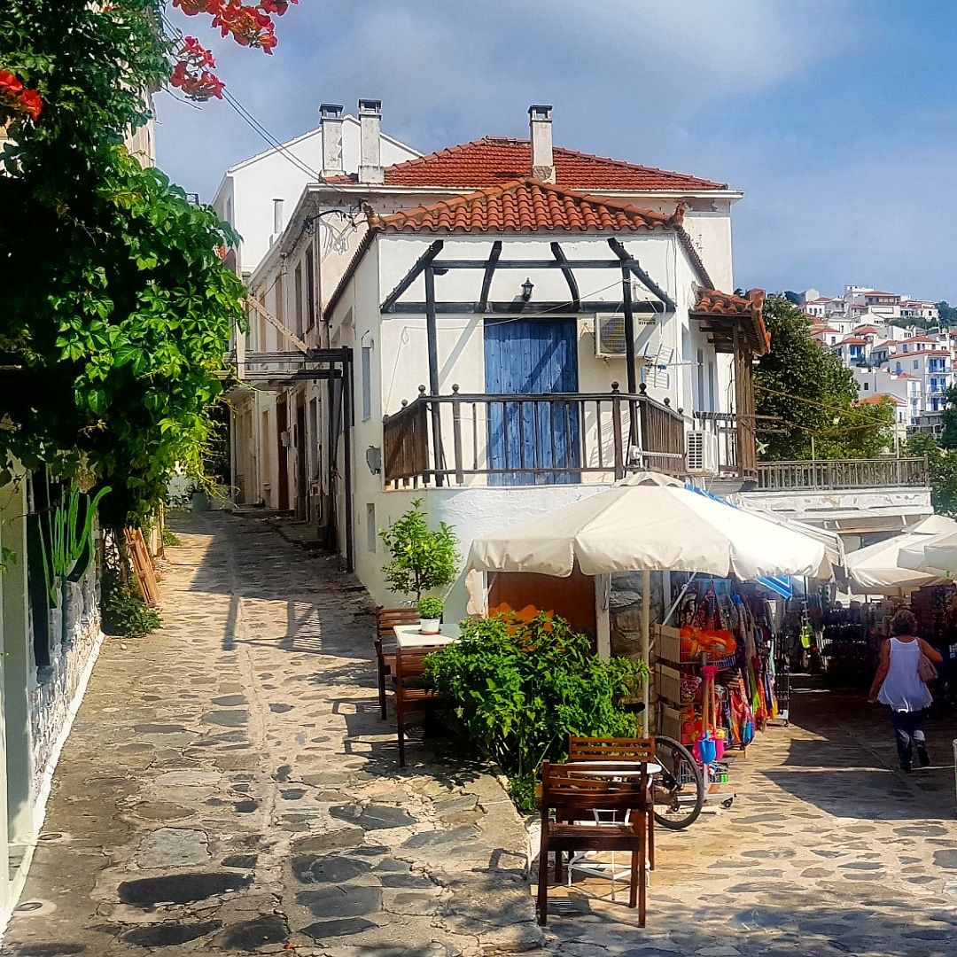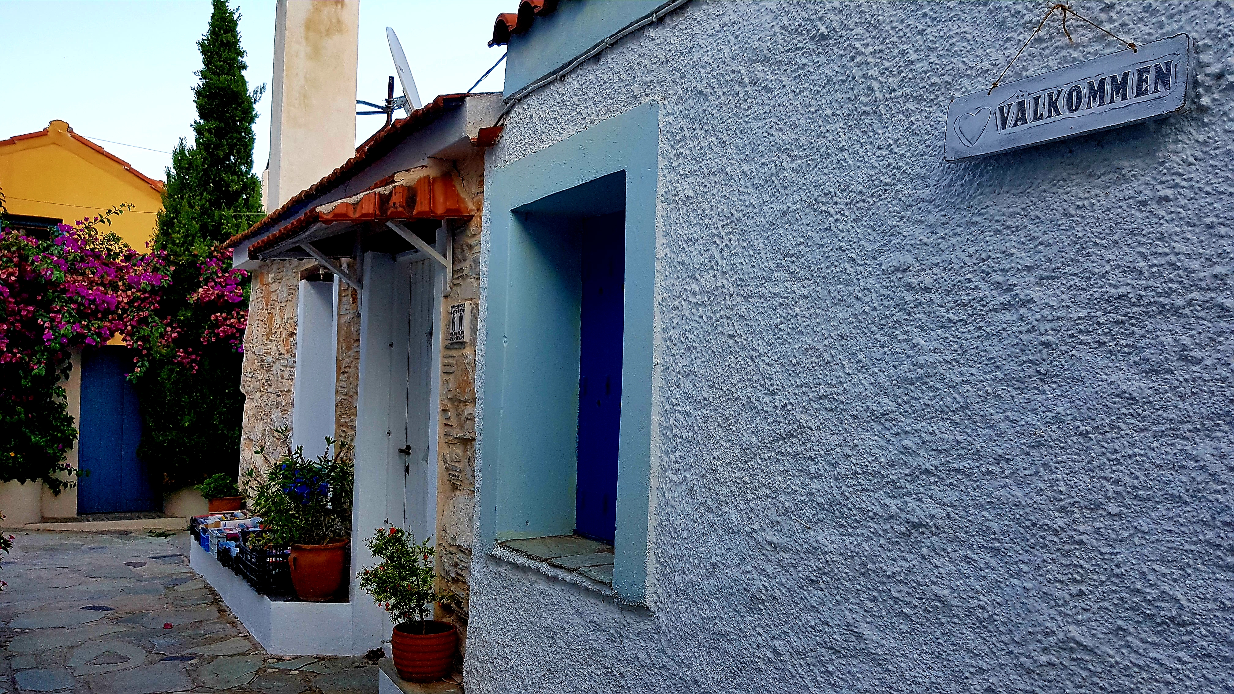 Vi hittade alltså ett urmysigt litet pensionat i dom gamla delarna av Skiathos stad högt upp i ”Plakes” & området utanför är helt bedårande💙som att vrida tillbaka klockan 30år i tiden. Gubbar o gummor sitter tidig morgon & sen kväll utanför sina små boenden & med sina pyttesmå trädgårdar rakt över gränden & hälsar glatt. Detta lilla område missade vi helt när vi var på Skiathos sist tyvärr men kommer 100% bo här igen.